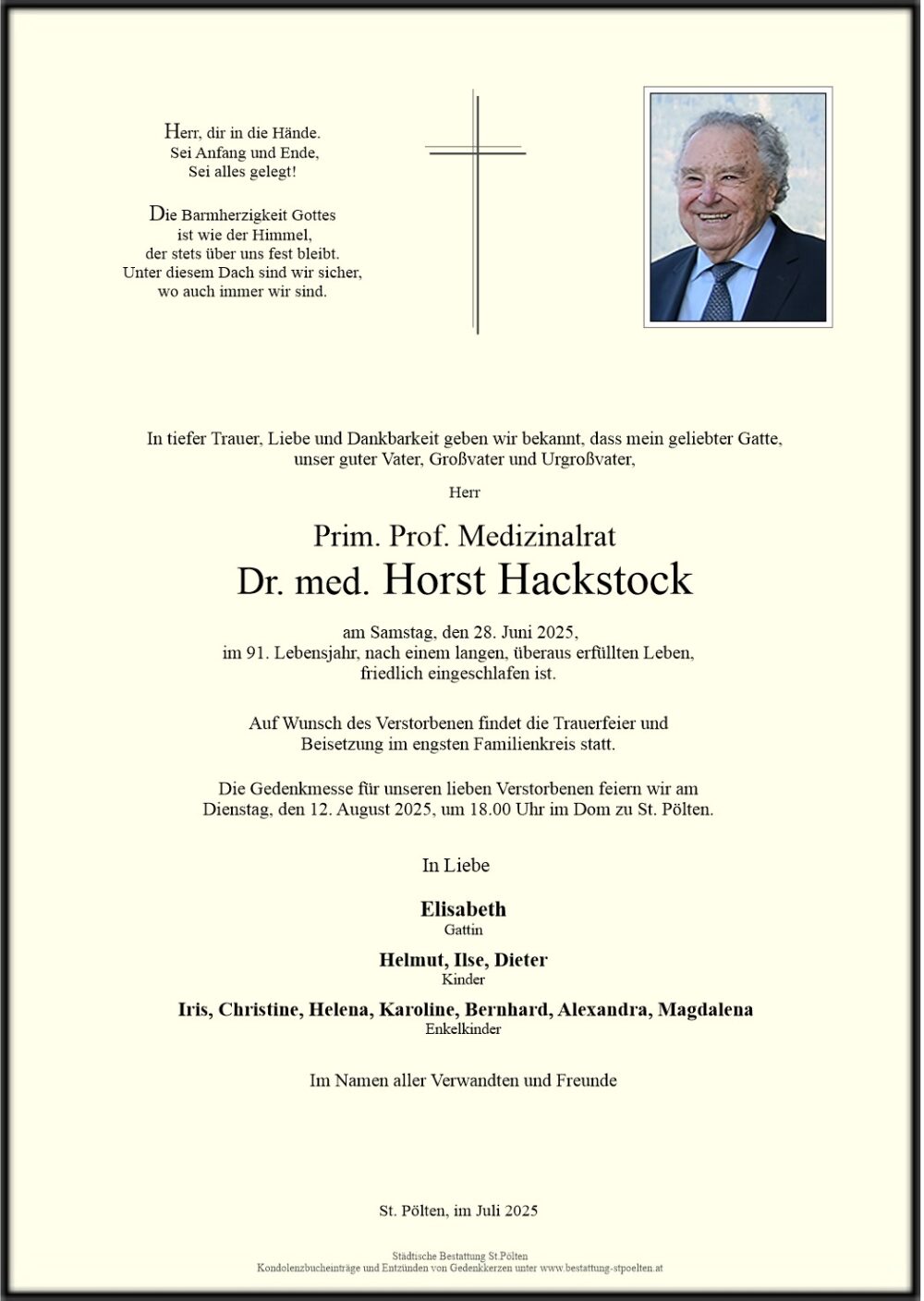 Wir geben bekannt, dass am Samstag den 28. Juni 2025, Prim. Prof. Medizinalrat Dr. Med. Horst Hackstock im 91. Lebensjahr nach einem langen, überaus erfüllten Leben, friedlich eingeschlafen ist.